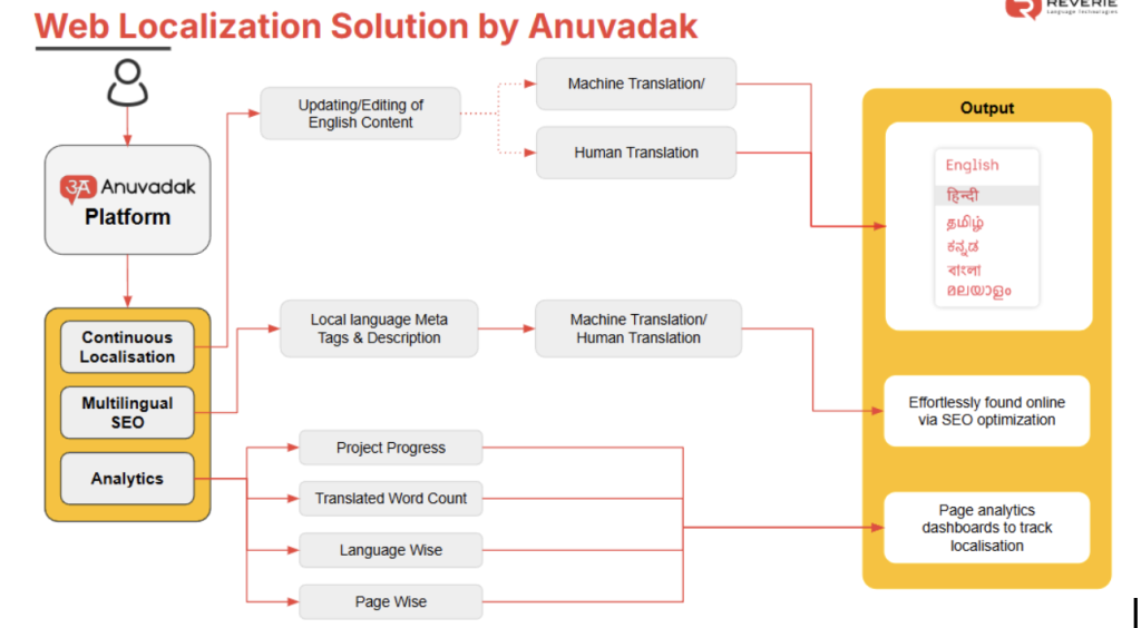 At the heart of Anuvadak is its Indian language specific neural machine translation (NMT) engine which expedites the website translation process. Glossary and smart transliteration ensures accurate and realistic translations ensuring consistent brand communication. The user-friendly dashboard makes proof-reading and editing of translated content easy. Continuous localization ensures any content change in the source English content is updated on the translated web pages in real-time. Below is a workflow of Anuvadak’s continuous website localization.